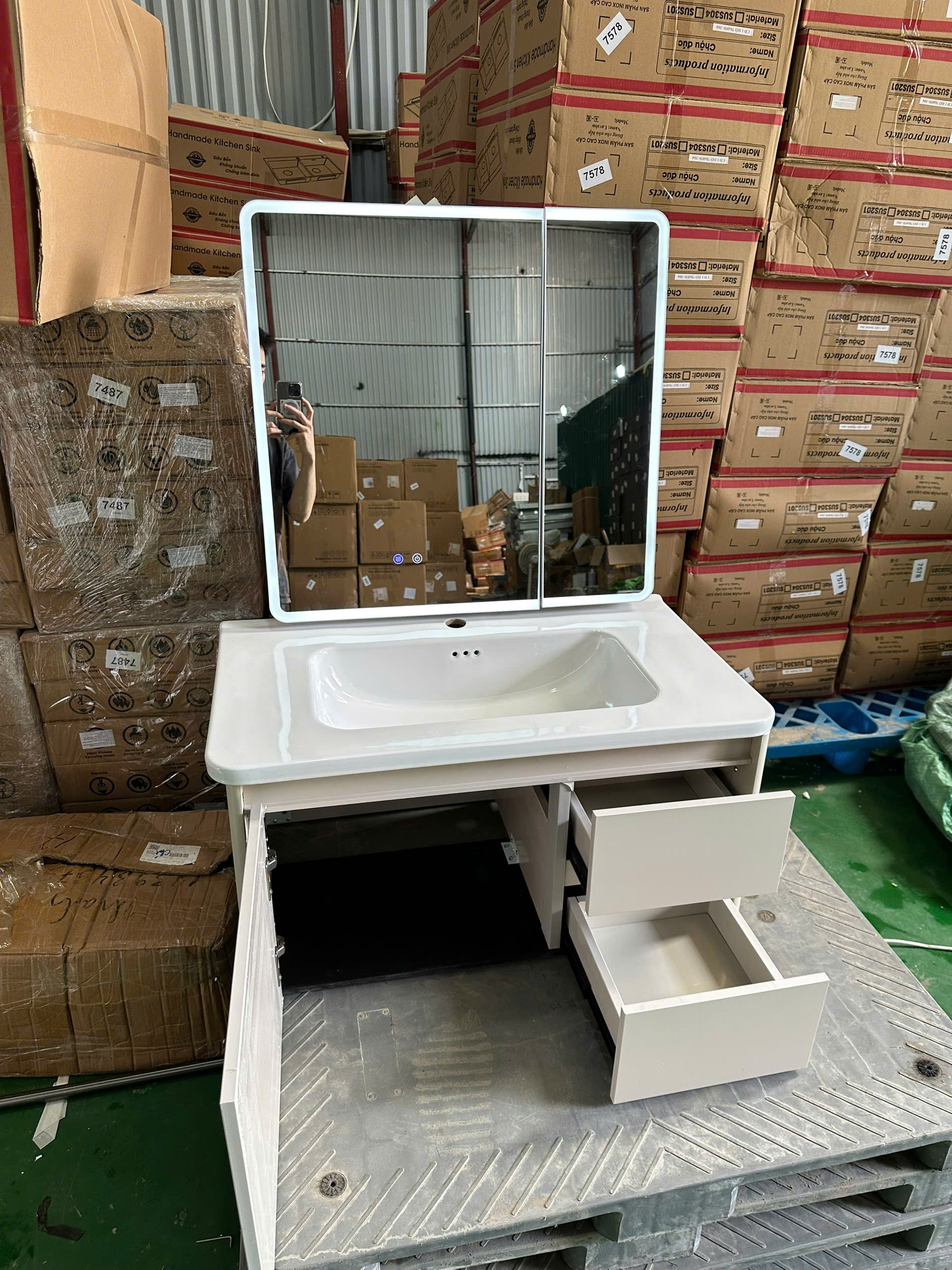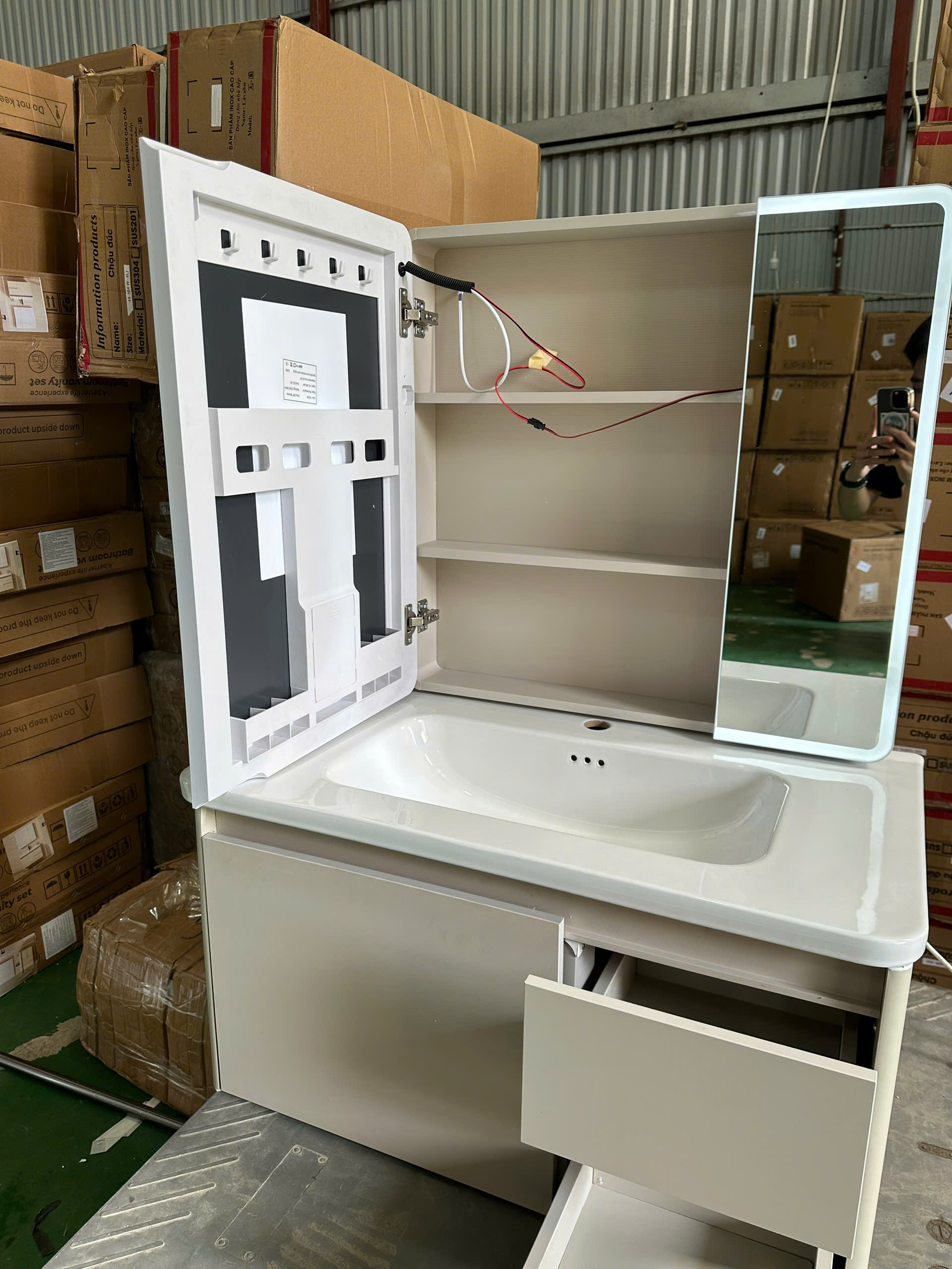 Bộ tủ chậu nhựa PVC 1 mở 2 kéo kèm tủ gương LED sấy – Giải pháp lưu trữ thông minh cho phòng tắm hiện đại