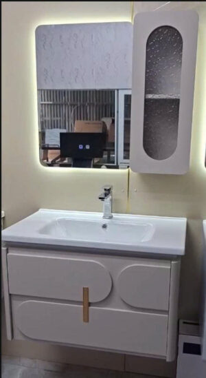 Phần tủ dưới làm từ nhựa PVC đặc cao cấp, chống nước tuyệt đối, không cong vênh, không mối mọt. Kết hợp cùng đèn LED cảm biến dưới tủ, tự động bật khi có chuyển động – mang lại trải nghiệm hiện đại, tiện nghi và tiết kiệm điện.